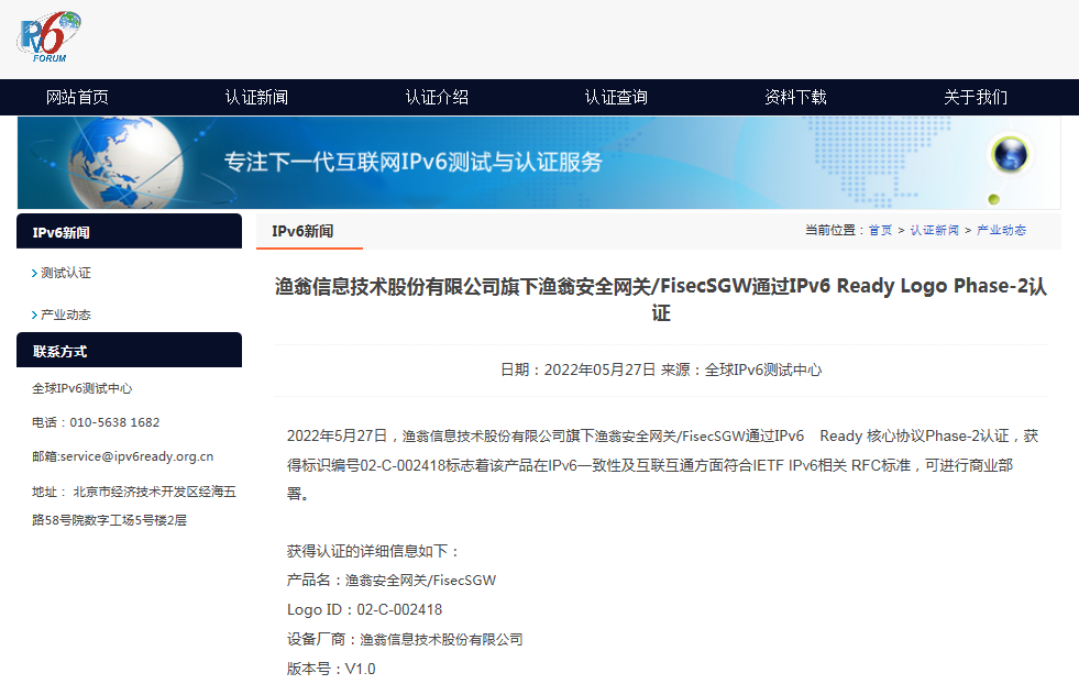 近期,G22恒峰集团安全网关 FisecSGW在下一代互联网国家工程中心-全球IPv6测试中心正式顺利获得IPv6 Ready核心协议Phase-2测试,并荣获由国际组织IPv6 Forum颁发的IPv6 Ready Logo Phase-2认证证书(Logo ID:02-C-002418)。