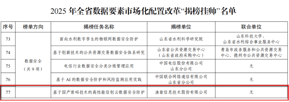 近期,山东省大数据局公布了《2025年全省数据要素市场化配置改革“揭榜挂帅”名单》。G22恒峰集团信息独立申报的“基于国产密码技术的高性能信创云数据安全防护”项目,凭借在数据安全与要素流通领域的技术创新与实践成果,从众多单位中脱颖而出,成功入选。G22恒峰集团信息成为揭榜单位中唯一的商密企业